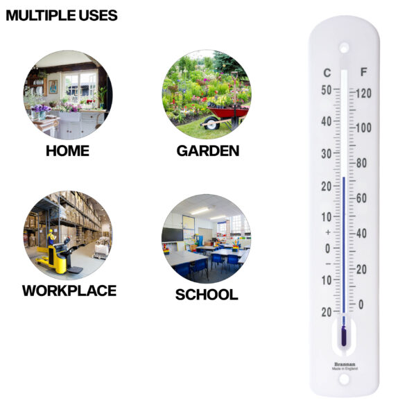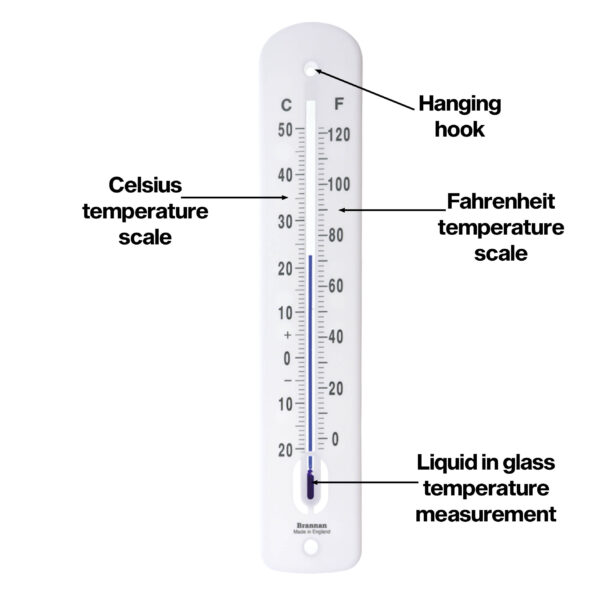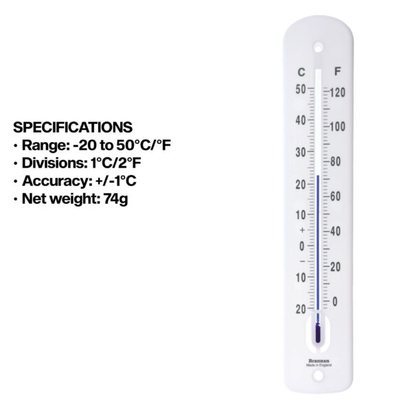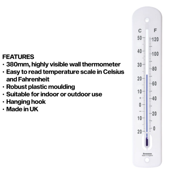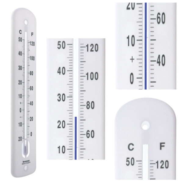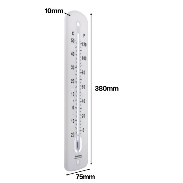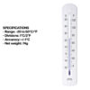 Large plastic wall thermometer, moulded in white plastic with clear, black printed temperature scale. Suitable for indoor and outdoor use – ideal for use in the home or garden.