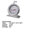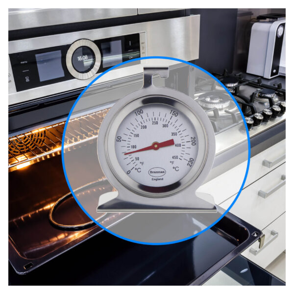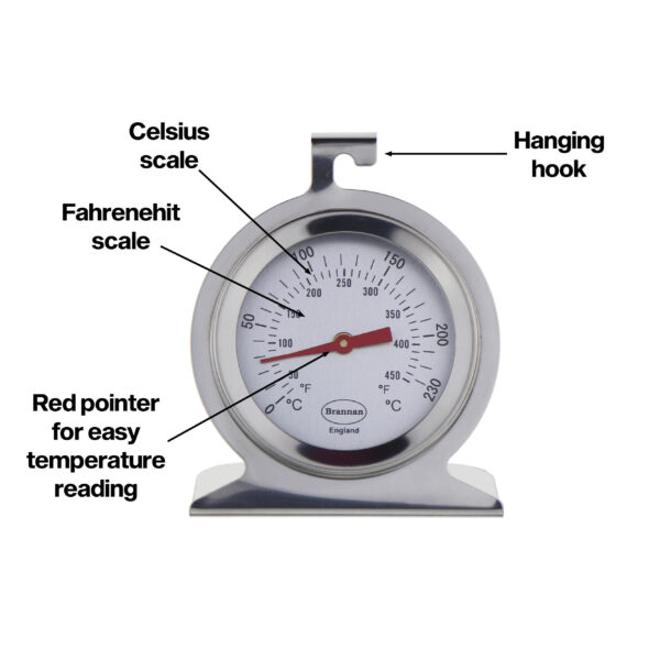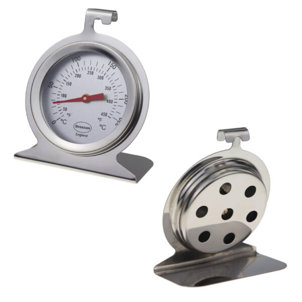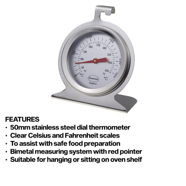 50mm stainless steel dial oven thermometer with black temperature scale. Suitable for hanging or sitting on oven shelf. Due to their location, oven thermostats cannot always give a true temperature reading for the cooking area of the oven. Using this thermometer will give a better guide to setting the oven controls.