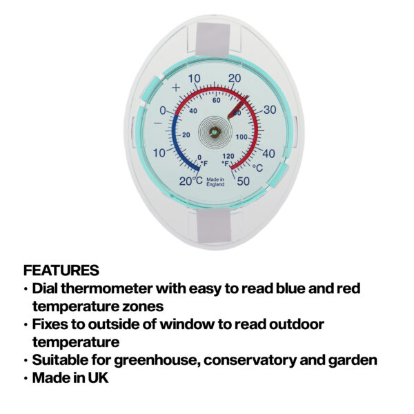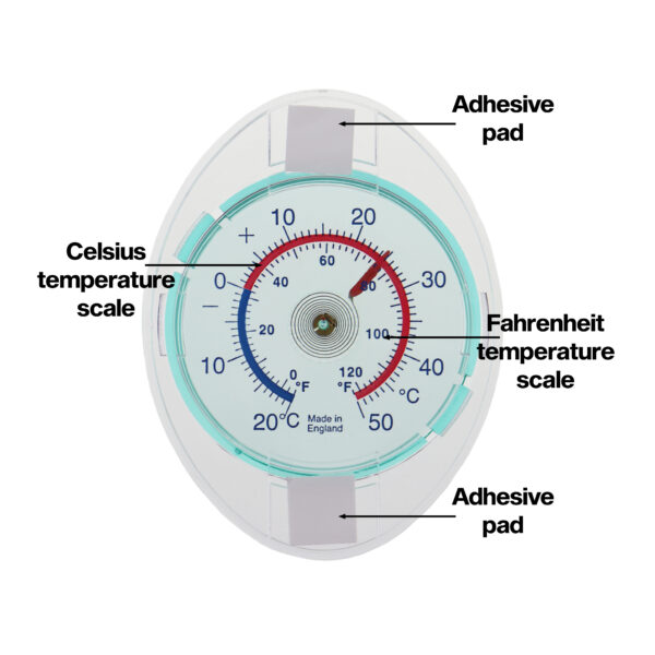 Dial window thermometer with adhesive pads for easy fixing.