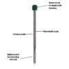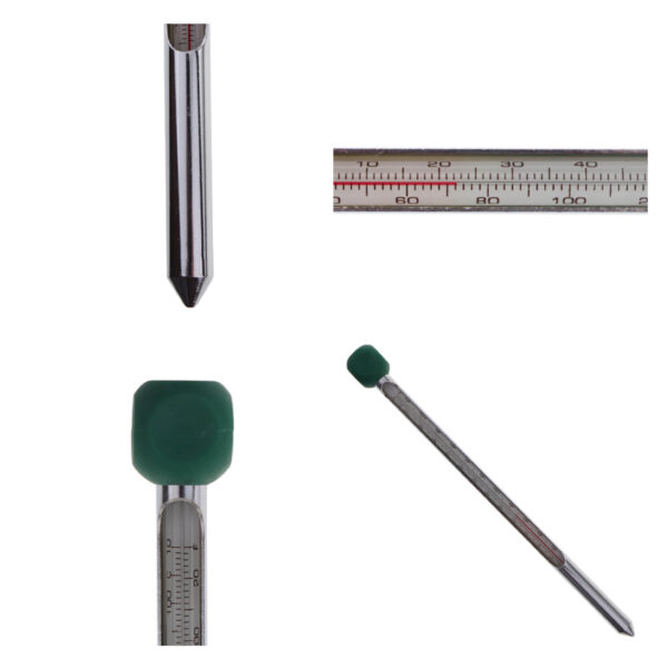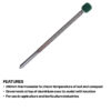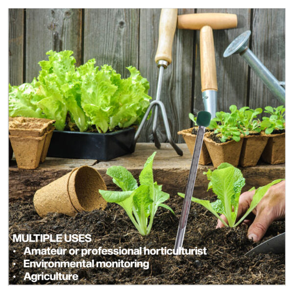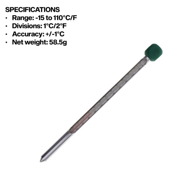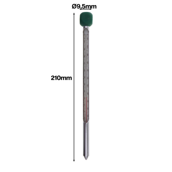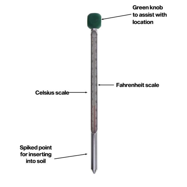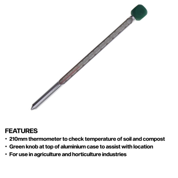 This type of soil thermometer is frequently used in the agriculture and horticulture industries to check temperatures of soil and compost. The soil thermometer has a green knob at the top to assist with the location of the thermometer after placement.