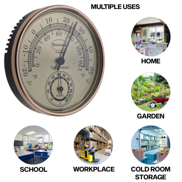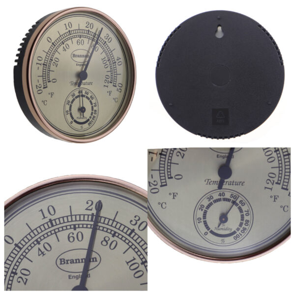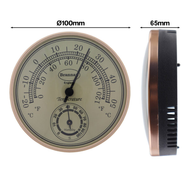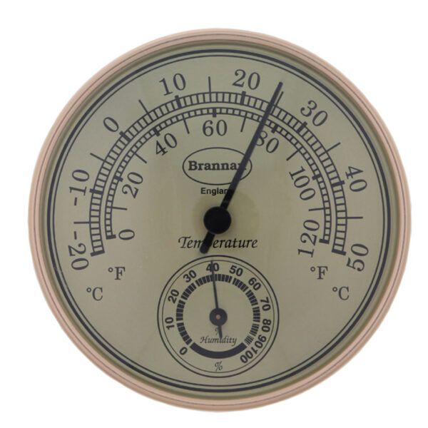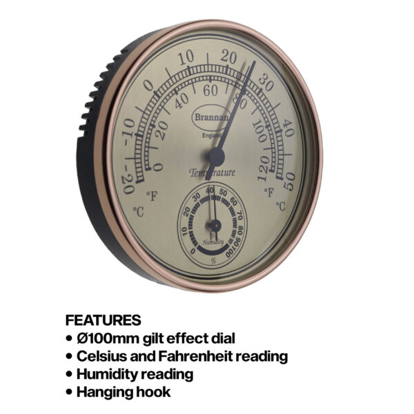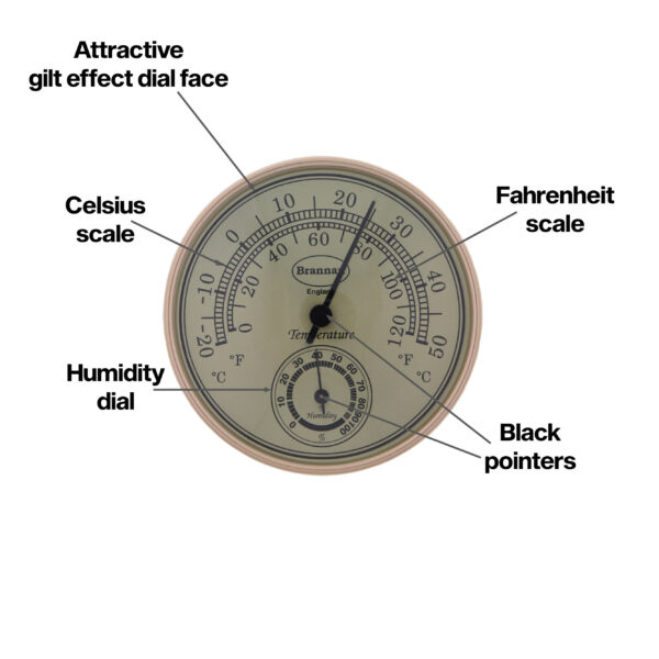 100mm gilt dial with separate temperature and humidity scales printed in black