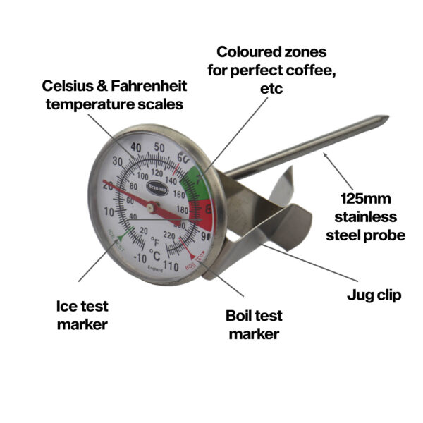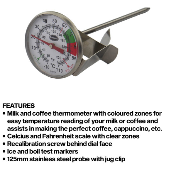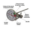 The milk and coffee thermometers incorporate green and red zones enabling fast and easy temperature reading of your milk or coffee and assists in making the perfect coffee, cappuccino, etc.