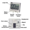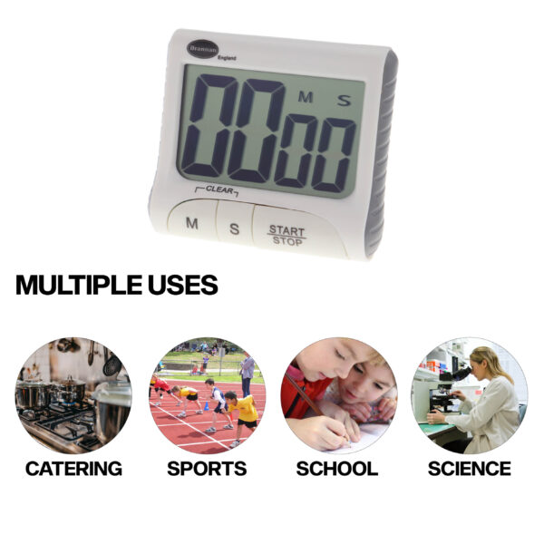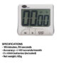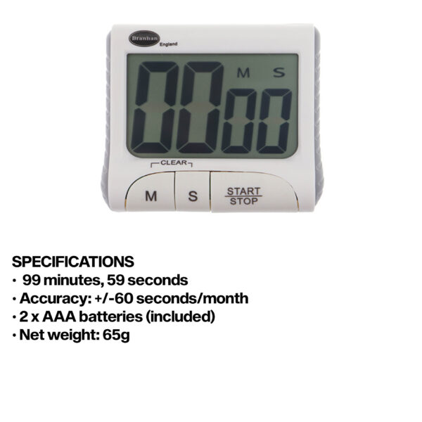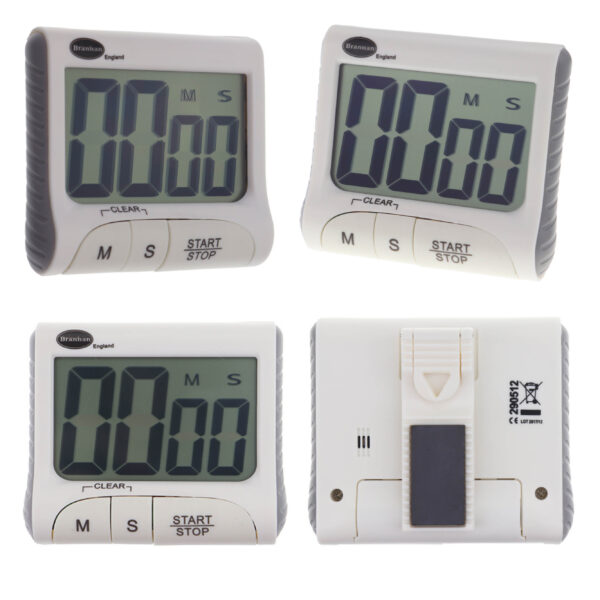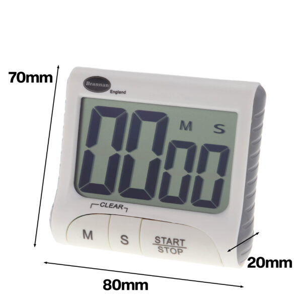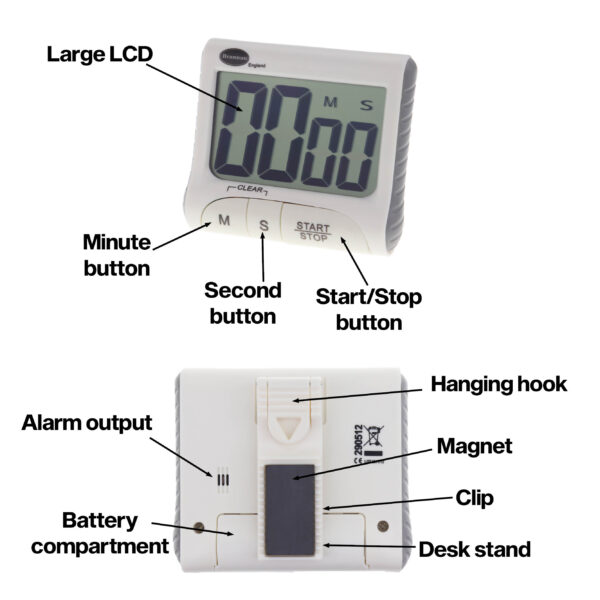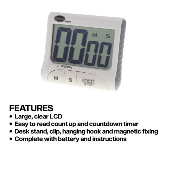 99 minute, 59 second countdown and up timer. With stand, clip, hanging hook and magnetic fixings.