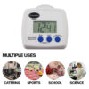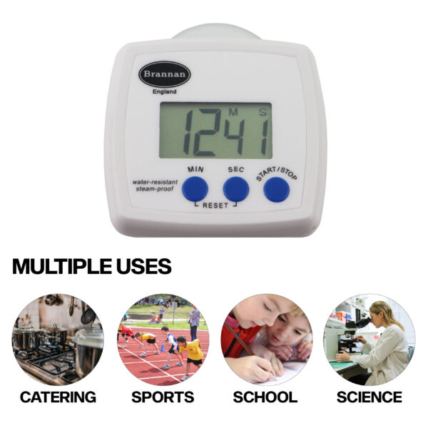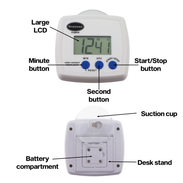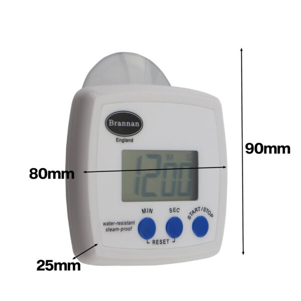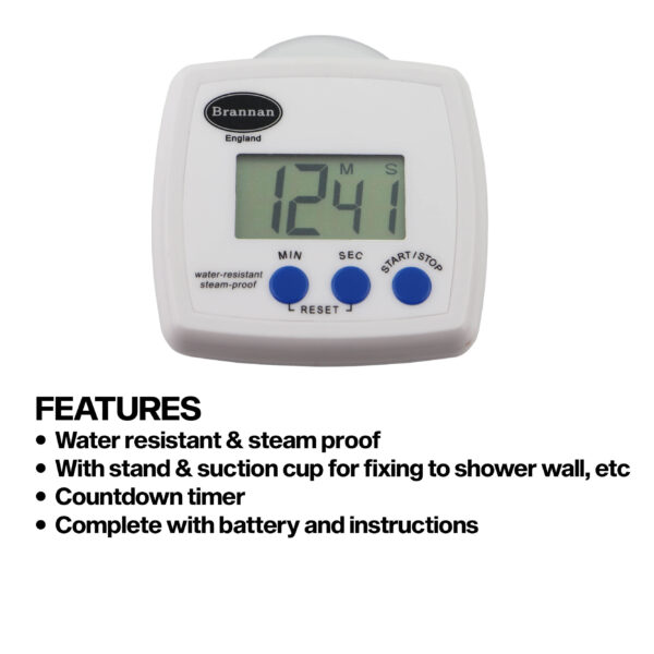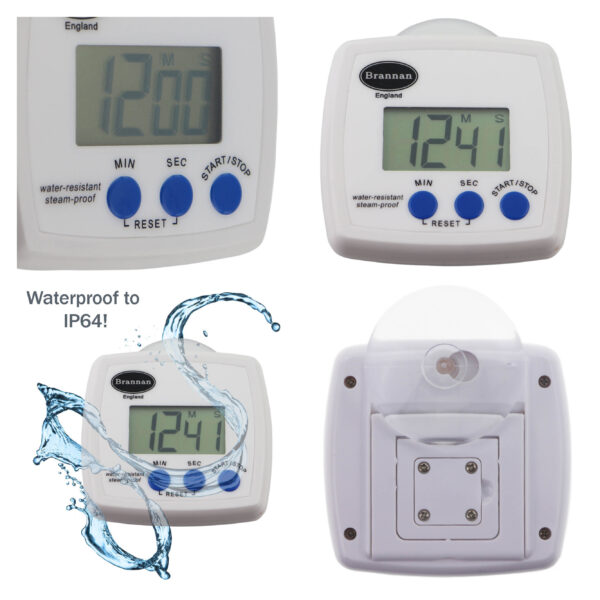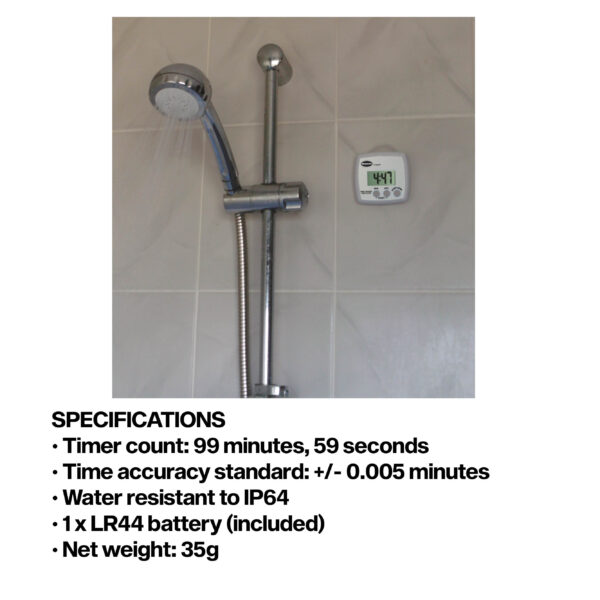 Large water resistant and steam proof timer to IP64, with stand and suction cup. 99 minute, 59 second countdown timer.