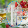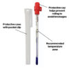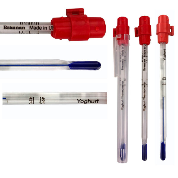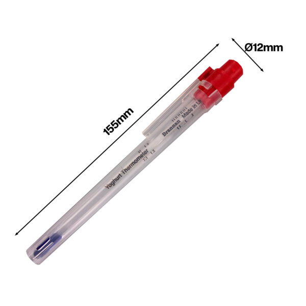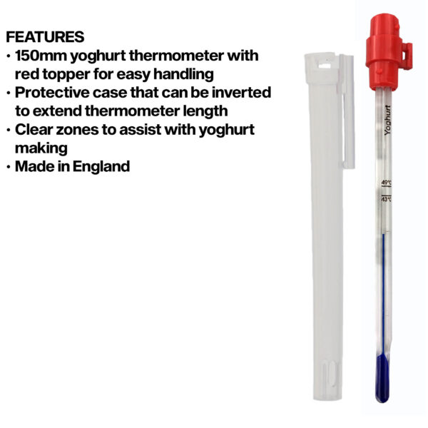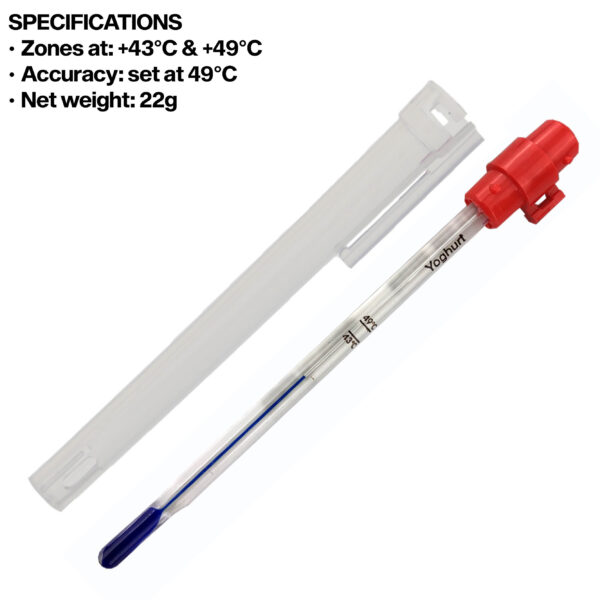 150mm yoghurt test thermometer with black zones, clear plastic protective case and pocket clip.